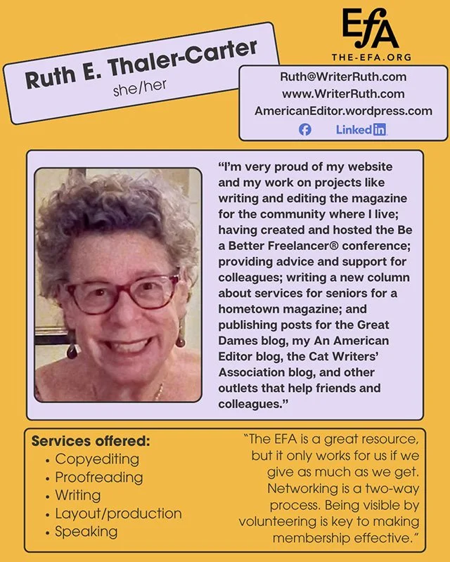 For my detailed insights on freelancing, consider purchasing my booklet, “Get Paid to Write! Getting Started as a Freelance Writer,” even if you can attend one of my presentations or webinars, because it covers more than I usually can discuss in a presentation! . Lots of tips, guidelines and resources, and new purchasers can subscribe to an update list. It’s only $20/copy, payable by check (send e-mail message to Ruth@writerruth.com for mailing address) or PayPal or Zelle (to Ruth@writerruth.com). It’s available in print or as a PDF.